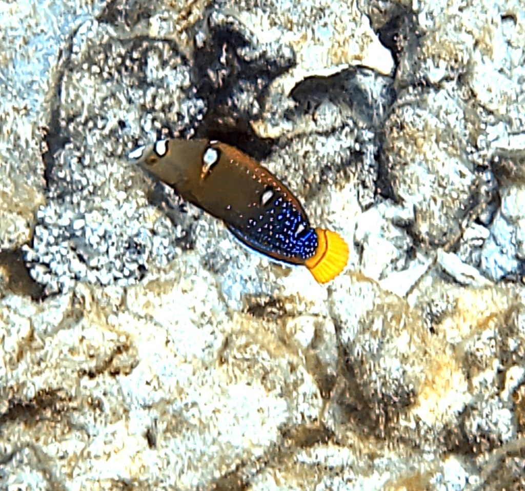 Here is a dragon wrasse — a juvenile rock moving wrasse. It is about 1-2 inches long.