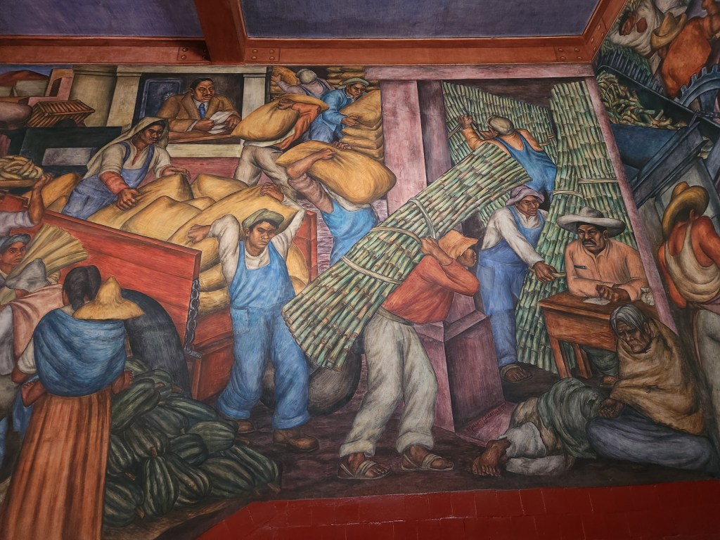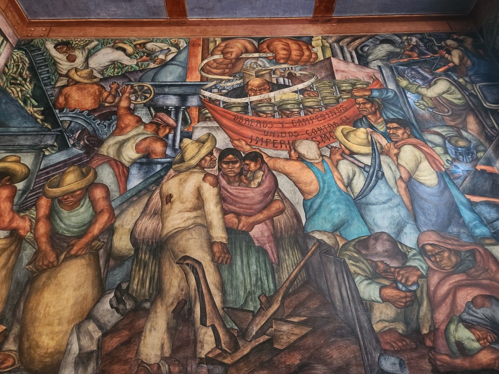 These are murals in a building near Merced Market. As with so many murals in Mexico City, they show the struggle of common people against a corrupt elite.