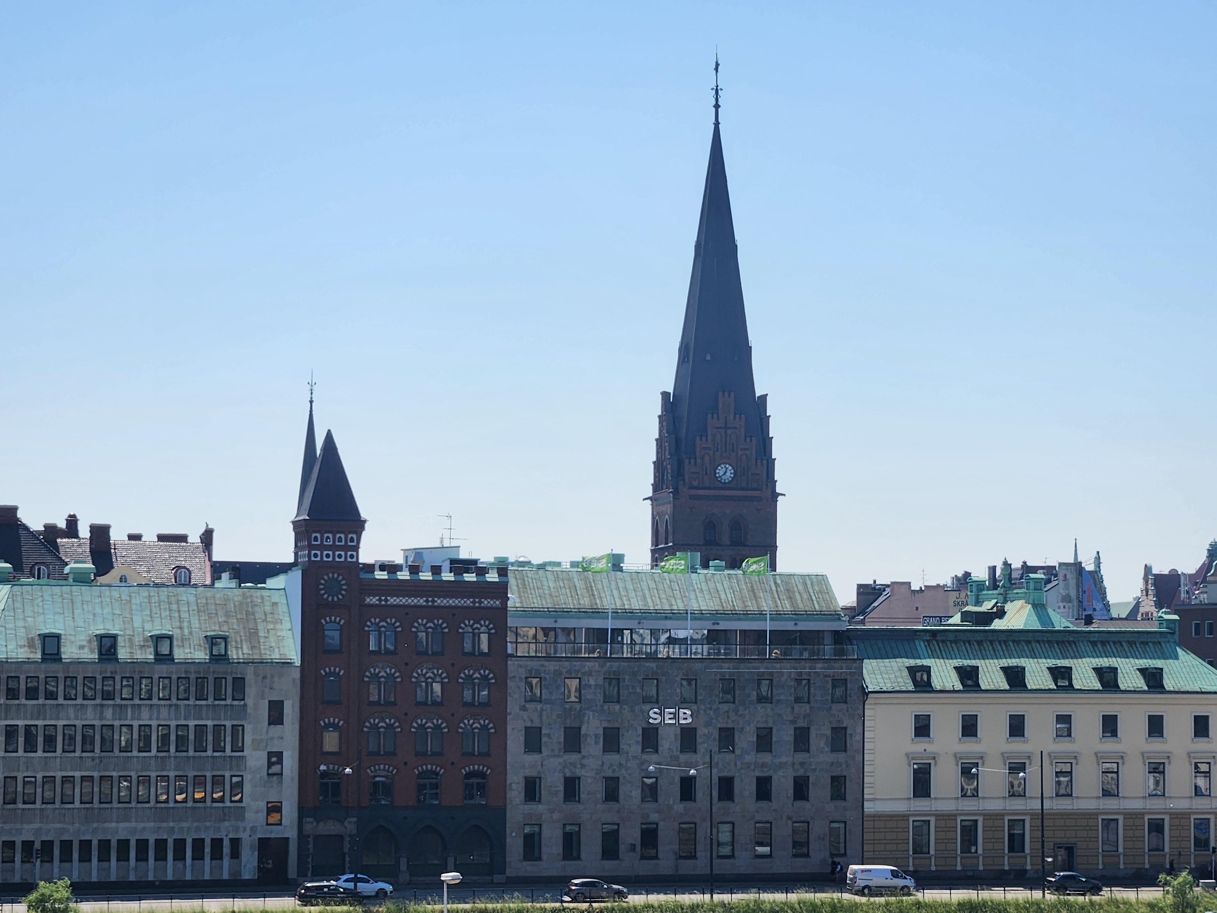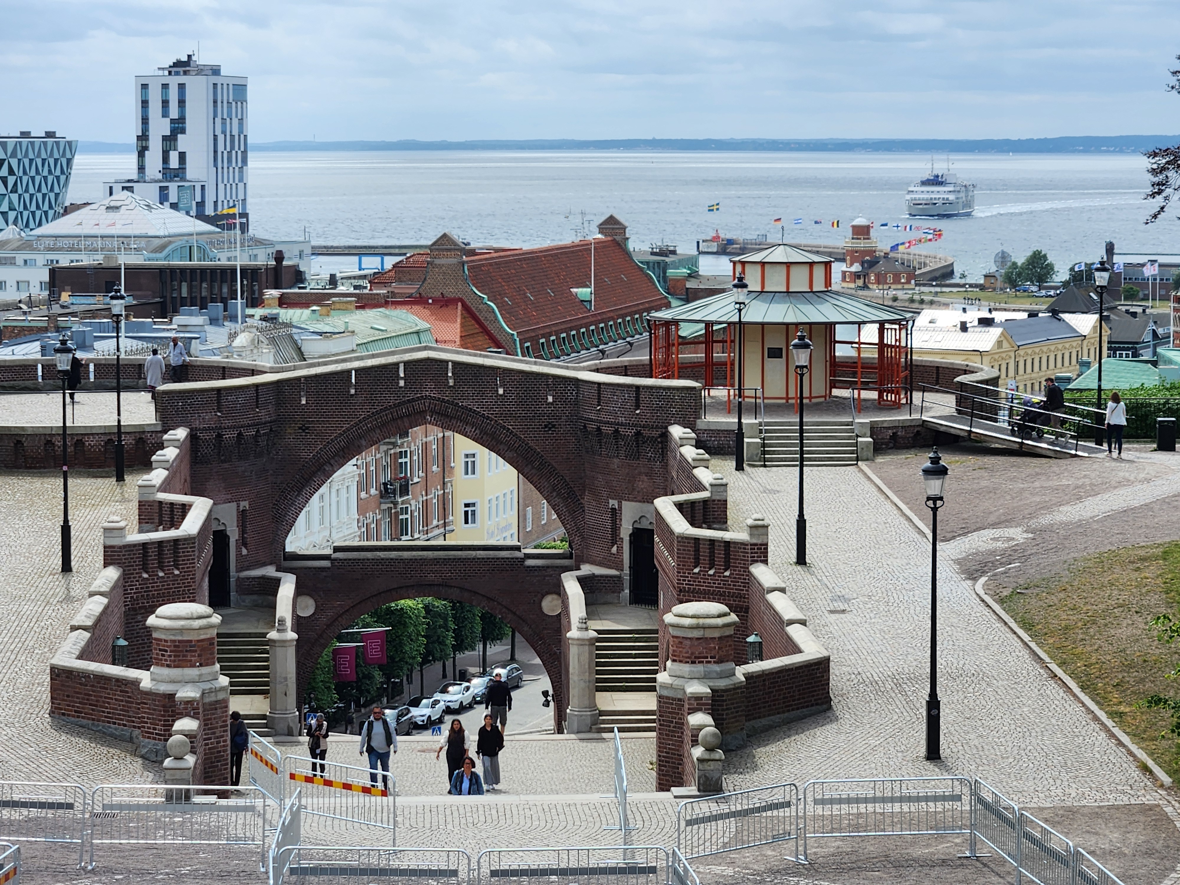 After Lund, we drove to Växjö and stopped on the way for lunch and a short visit in Helsingborg. Helsingborg is only about 2 miles from the Danish coast. Because of its strategic position, it has a 12th century fortress. We climbed up to see the view which showed both modern including a modern ferry, and old. Beautiful view.