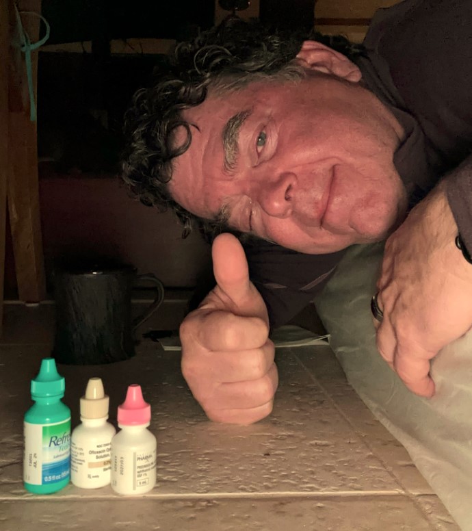 I know two people who had partial detachments and were not able to able to treat them as quickly as they should have. One has regained full vision, the other never will. Fortunately, I noticed the symptoms, went to specialists three times, and during the third visit, Doctor Eugene Ng (to whom I’m most grateful) said “uh-oh”. This is not something you want to hear. We did the ultrasound and saw it was clearly torn. The two lines at the bottom of this ultrasound image are my retina pulling off the back of my eye. I went for emergency surgery later that day. That entailed flying from the Big Island of Hawaii to Oahu which is about a 30 minute flight away, where they have a hospital with appropriate specialized equipment and trained nurses to support the surgeon. We came back the next day and I then spent the following week working from my phone lying face down and/or lying on my side looking at the palm trees and listening to podcasts. Thankfully I had Janet and other family members around to help out. And then 4 weeks later, going in for a routine post-op checkup, we found some anomalies, went to a specialist who did the deep imaging, and found that I have yet another partial detachment in evidence. Hence surgery #2 which is a little different and hopefully will be a once-and-for-all fix. Dr. Eng used a series of laser zaps. Imagine looking into a bright light and the doc looking through a special lens to see the places to fix and he pulls the trigger and a laser cooks a little bit of your eye to make the scar tissue hold it all together. I’ve done this twice now, which hopefully is all that’s needed. I will not know that for another month or two, but everyone is fairly confident that this will work.