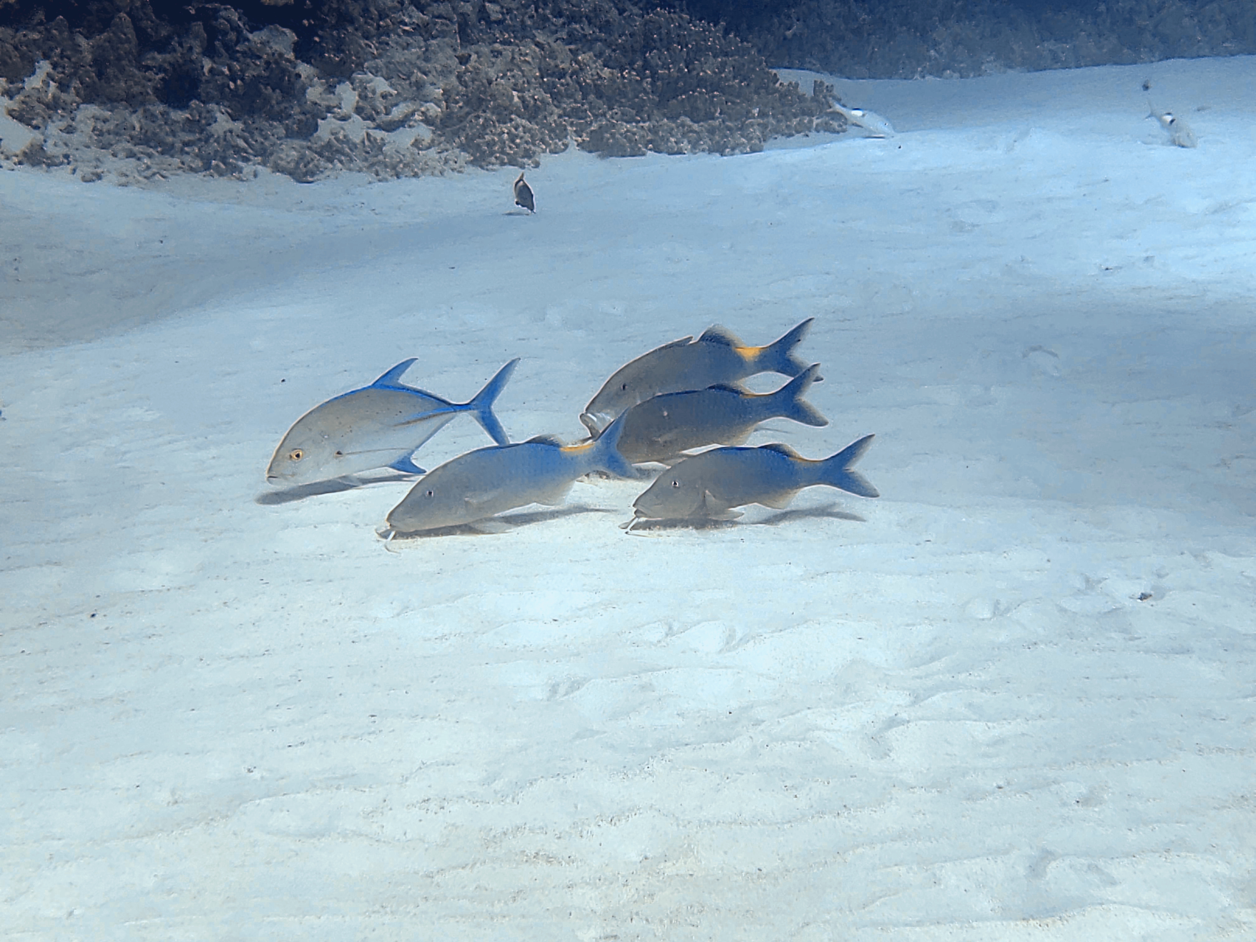 Above to the left are juvenile rock mover wrasse. They are only a couple inches. On the right is the adult which has distinctive markings on its face. It can get to be about 10 inches.