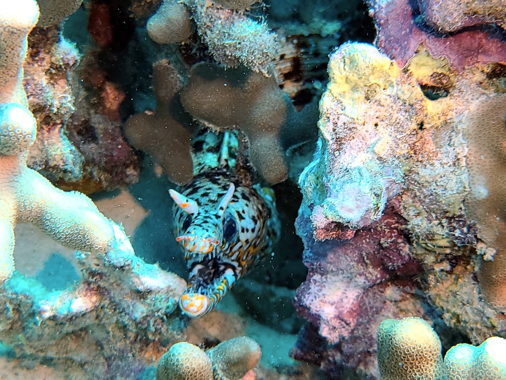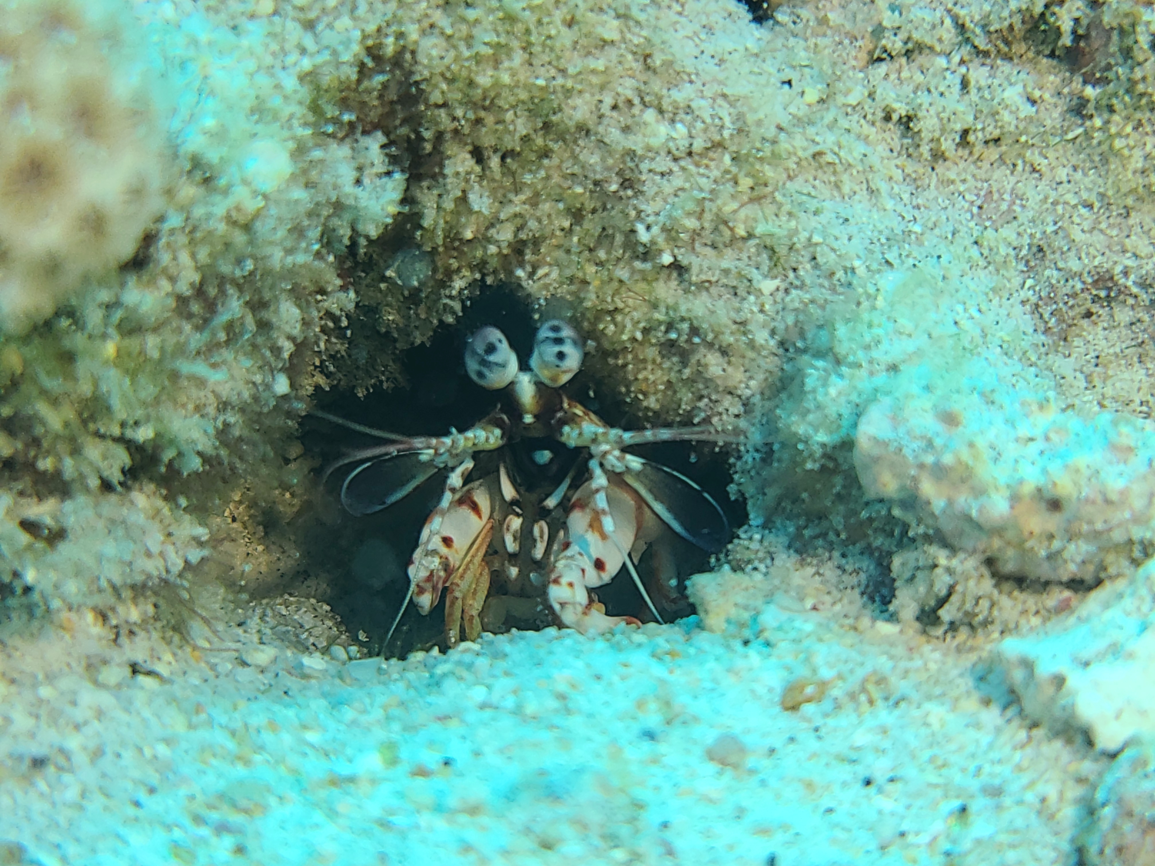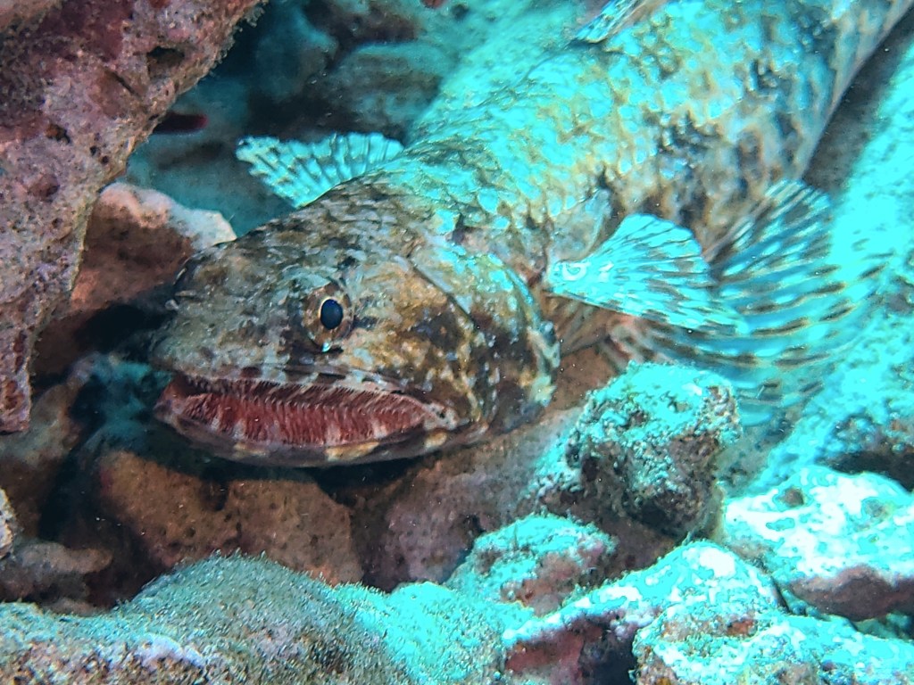 Red mouth lizard fish on the left and a mantis shrimp on the right.