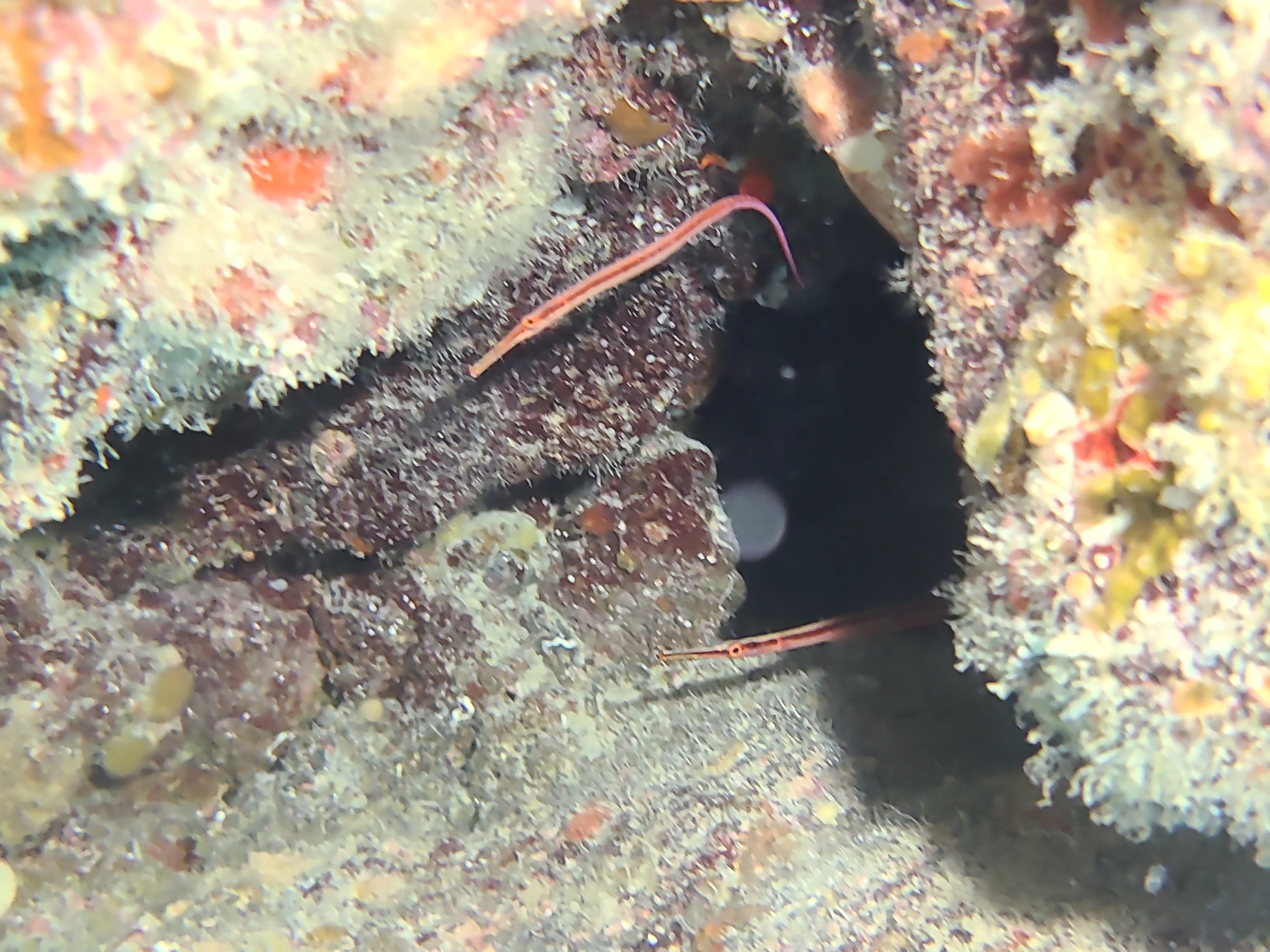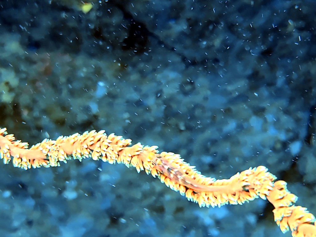 On the left is a goby on wire coral — very small. On the right is a dragon eel.