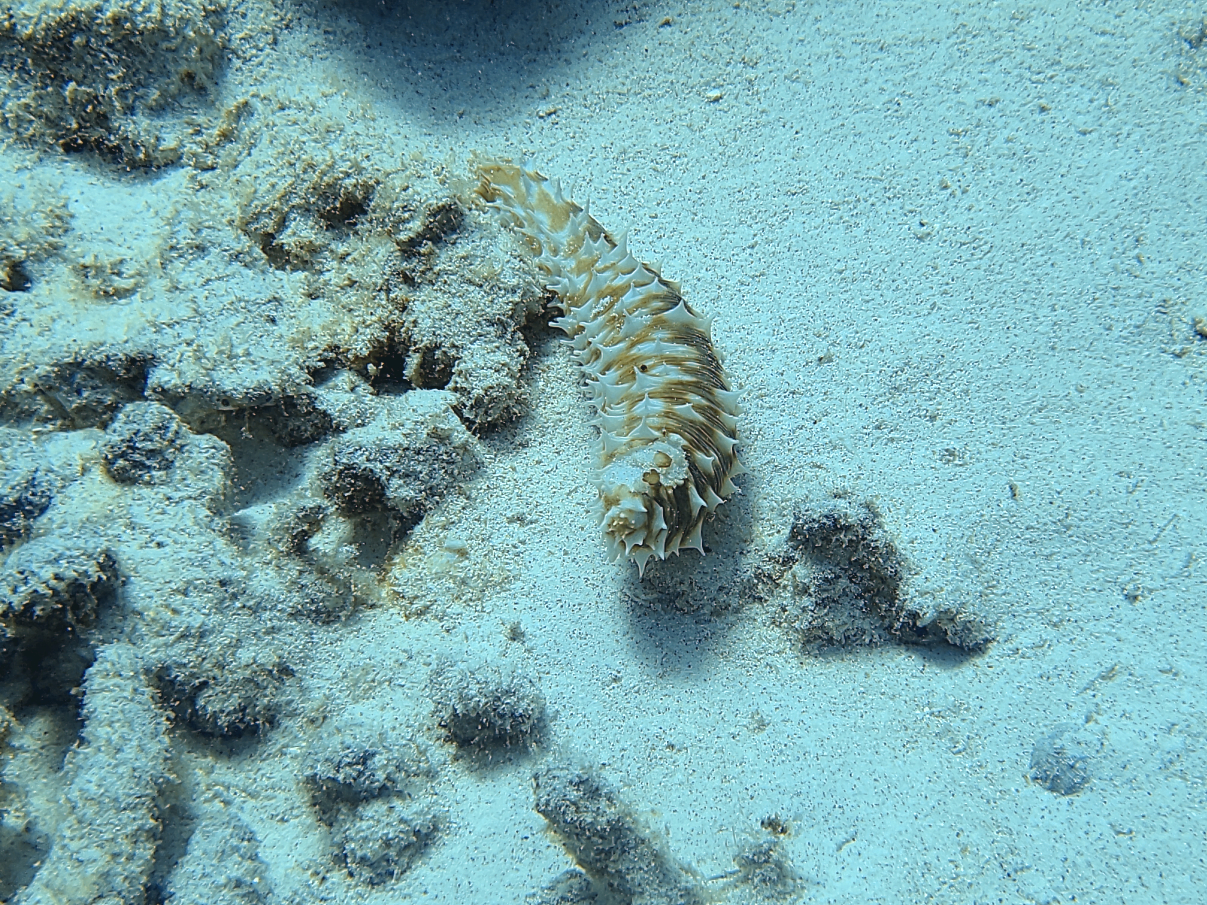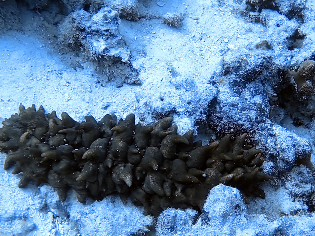The top row above are some different sea cucumbers. On the bottom is a collector urchin, all white means juvenile. On the right is a feather duster worm.