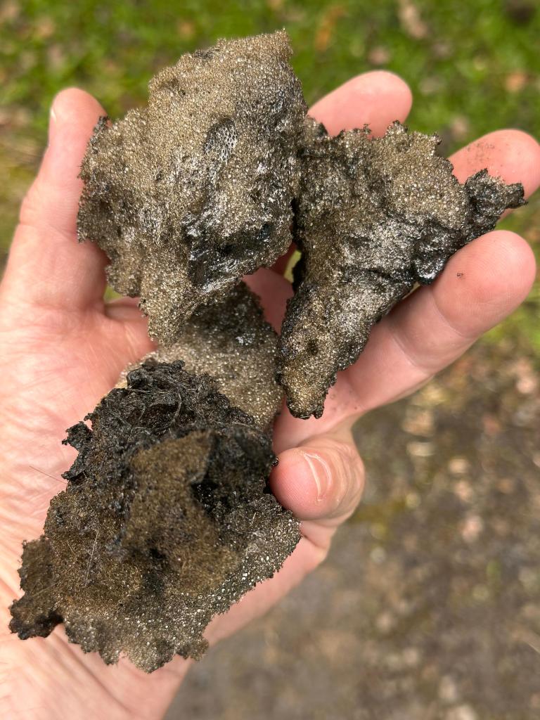With a visitor in tow, we rushed to the other side of the island to see Episode 41. Which we did not see. The volcano was spouting Tephra — chunks of volcanic ash. Air quality was terrible and the park was closed. I guess we could have watched the report as we drove. We did stop for lunch and took photos of the tephra before heading back. It is very light weight and has lots of Pele’s hair — or little bits of glass slivers in. You can see the roads covered with ask.