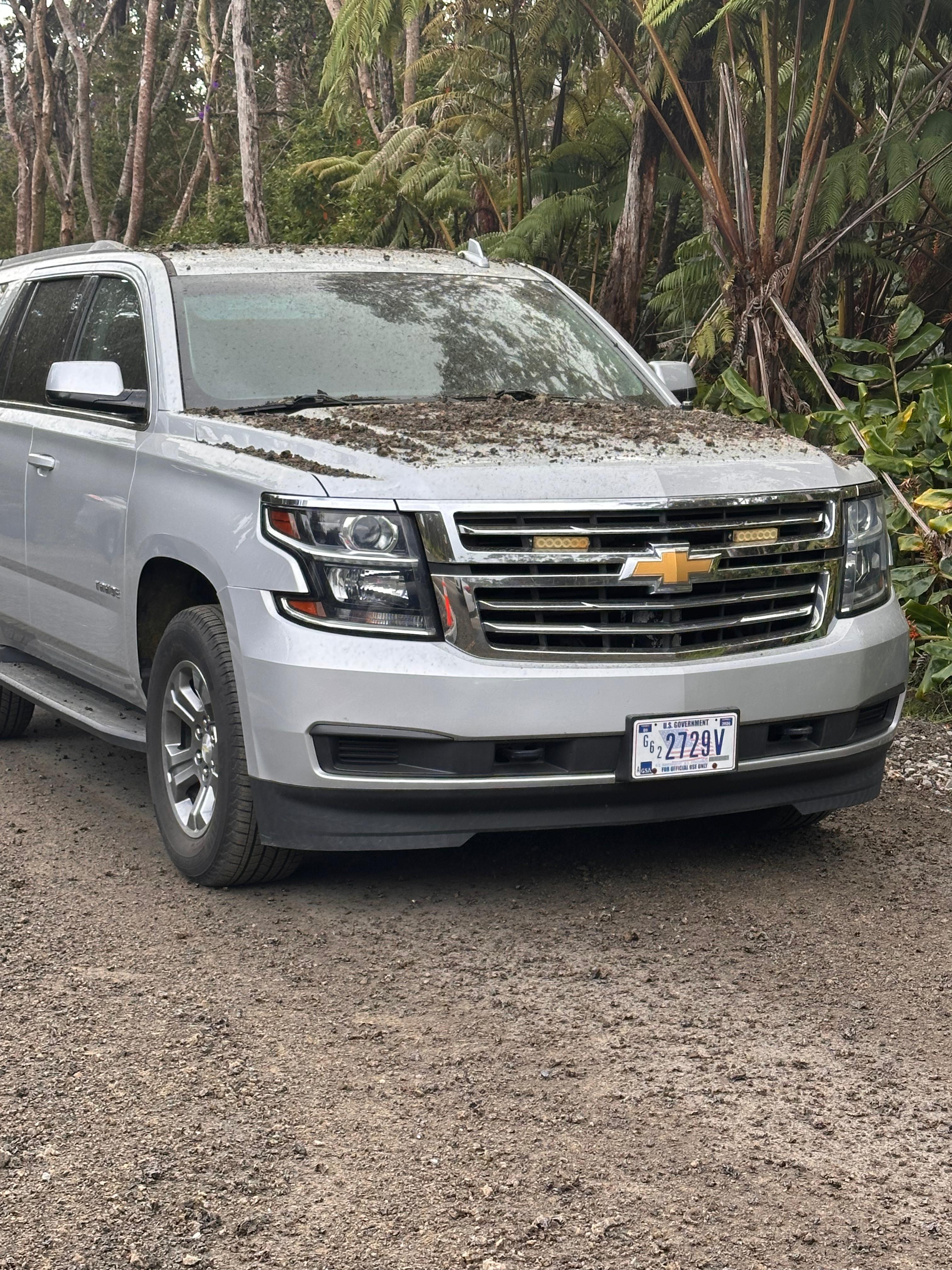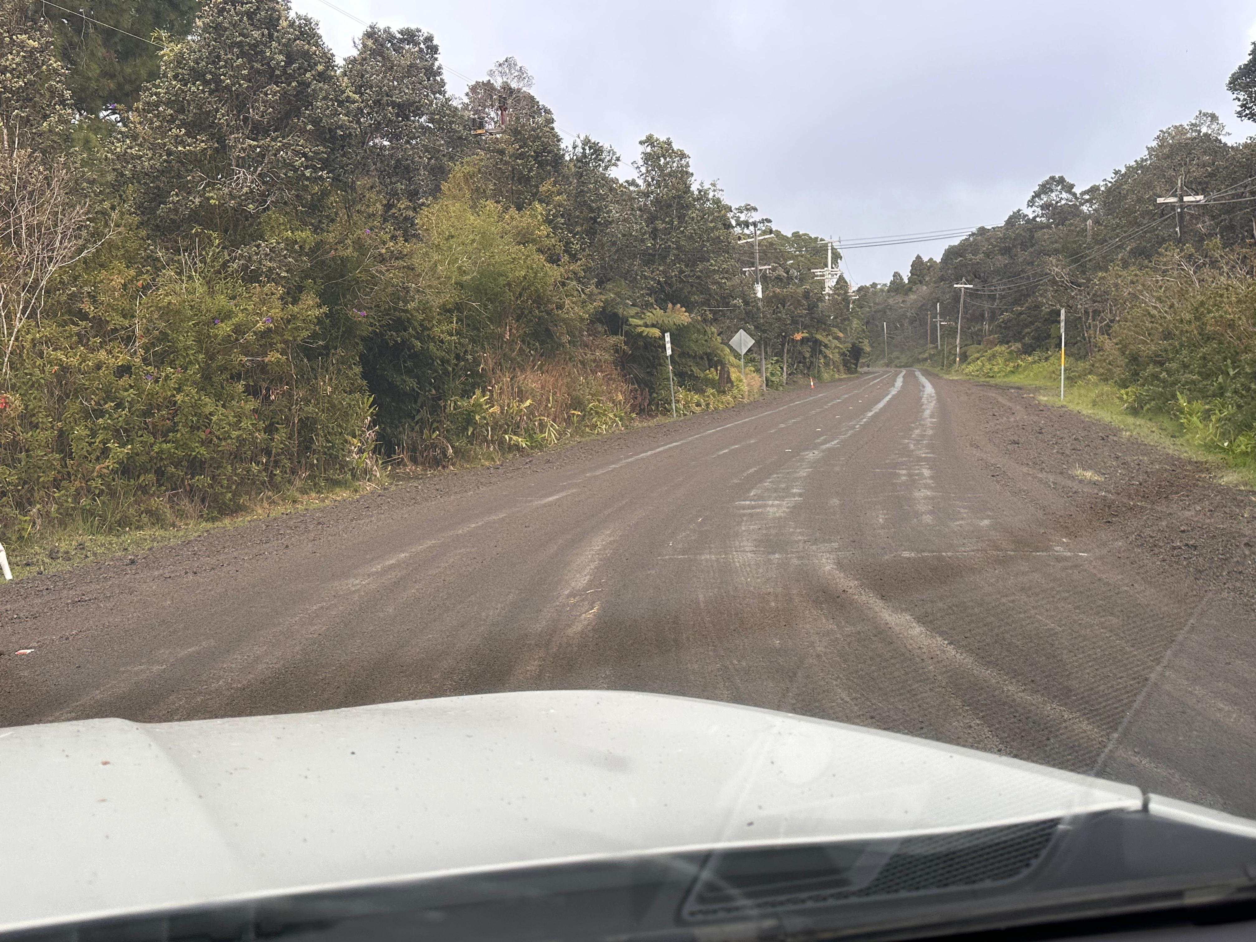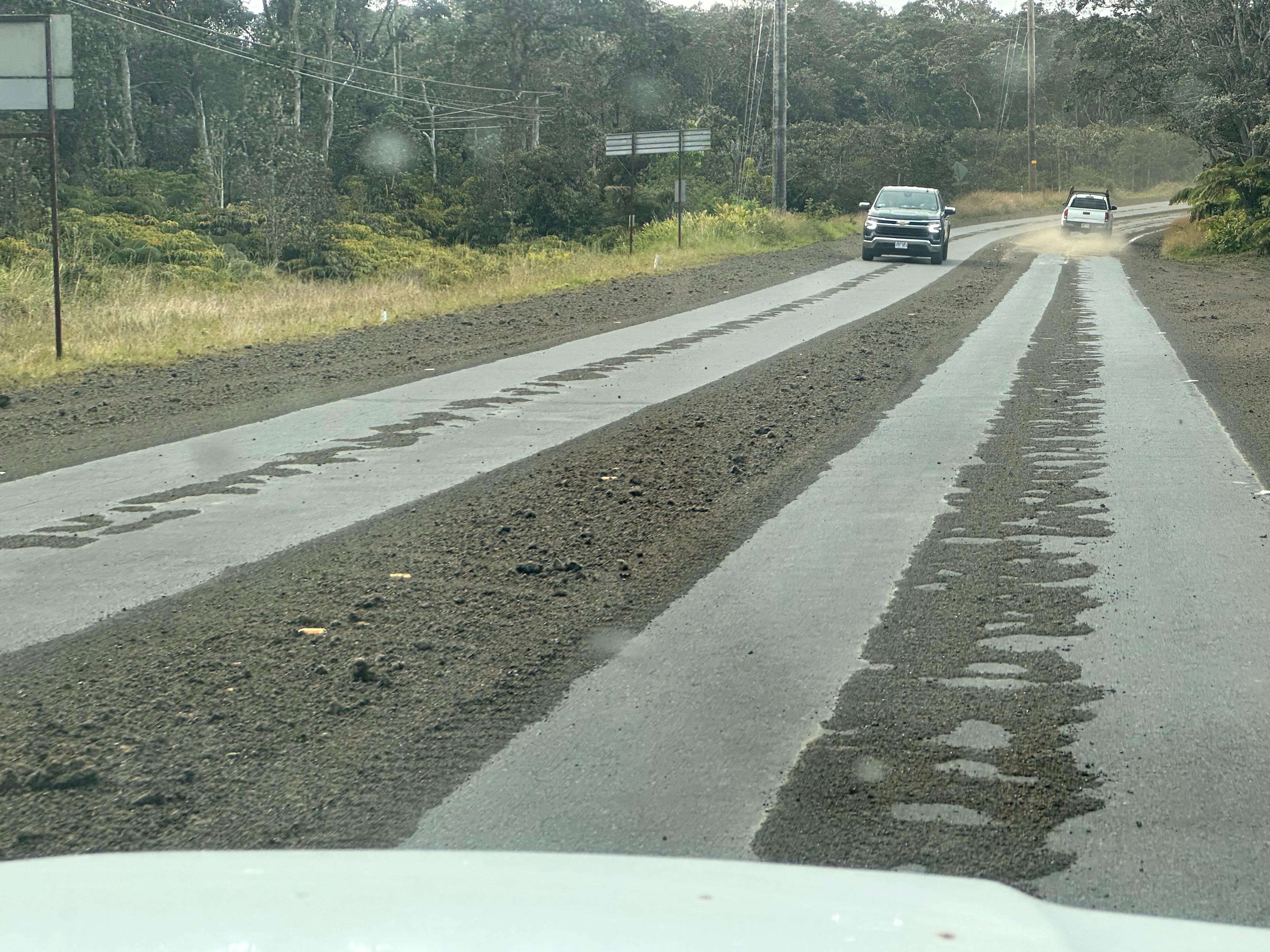 With a visitor in tow, we rushed to the other side of the island to see Episode 41. Which we did not see. The volcano was spouting Tephra — chunks of volcanic ash. Air quality was terrible and the park was closed. I guess we could have watched the report as we drove. We did stop for lunch and took photos of the tephra before heading back. It is very light weight and has lots of Pele’s hair — or little bits of glass slivers in. You can see the roads covered with ask.
