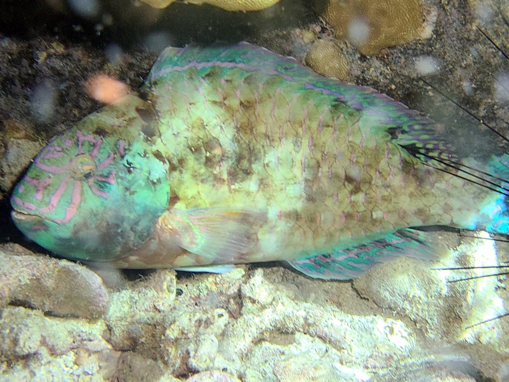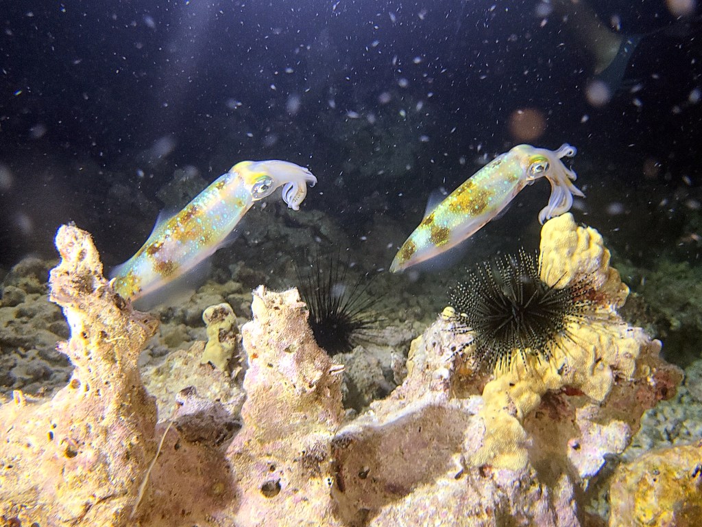 We went night diving and saw some amazing things I have never seen before: an eel eating a butterfly fish, squid just hanging out, a sponge crab. Also saw a big manta and some other more common night dive things.
